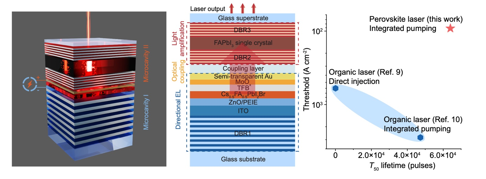 यन्त्रले कथित रूपमा कुशलतापूर्वक विद्युतीय रूपमा उत्तेजित माइक्रोकाभिटी पेरोभस्काइट एलईडीद्वारा उत्पन्न हुने फोटानको ठूलो संख्यालाई दोस्रो माइक्रोकभिटीमा जोड्छ। त्यहाँ, तिनीहरू एकल-क्रिस्टल पेरोभस्काइट गेन माध्यमबाट उत्साहित छन्, 82.7% सम्मको युग्मन दक्षताको साथ लेसिङ उत्पन्न गर्दै। यो नयाँ सेमीकन्डक्टर लेजर ट्रिगर गर्नको लागि आवश्यक प्रारम्भिक प्रवाह 92 एम्पीयर प्रति वर्ग सेन्टिमिटर हो, उत्कृष्ट विद्युतीय रूपमा संचालित जैविक लेजरहरूको भन्दा ठूलो परिमाणको अर्डर, र उत्कृष्ट स्थिरता प्रदर्शन गर्दछ।